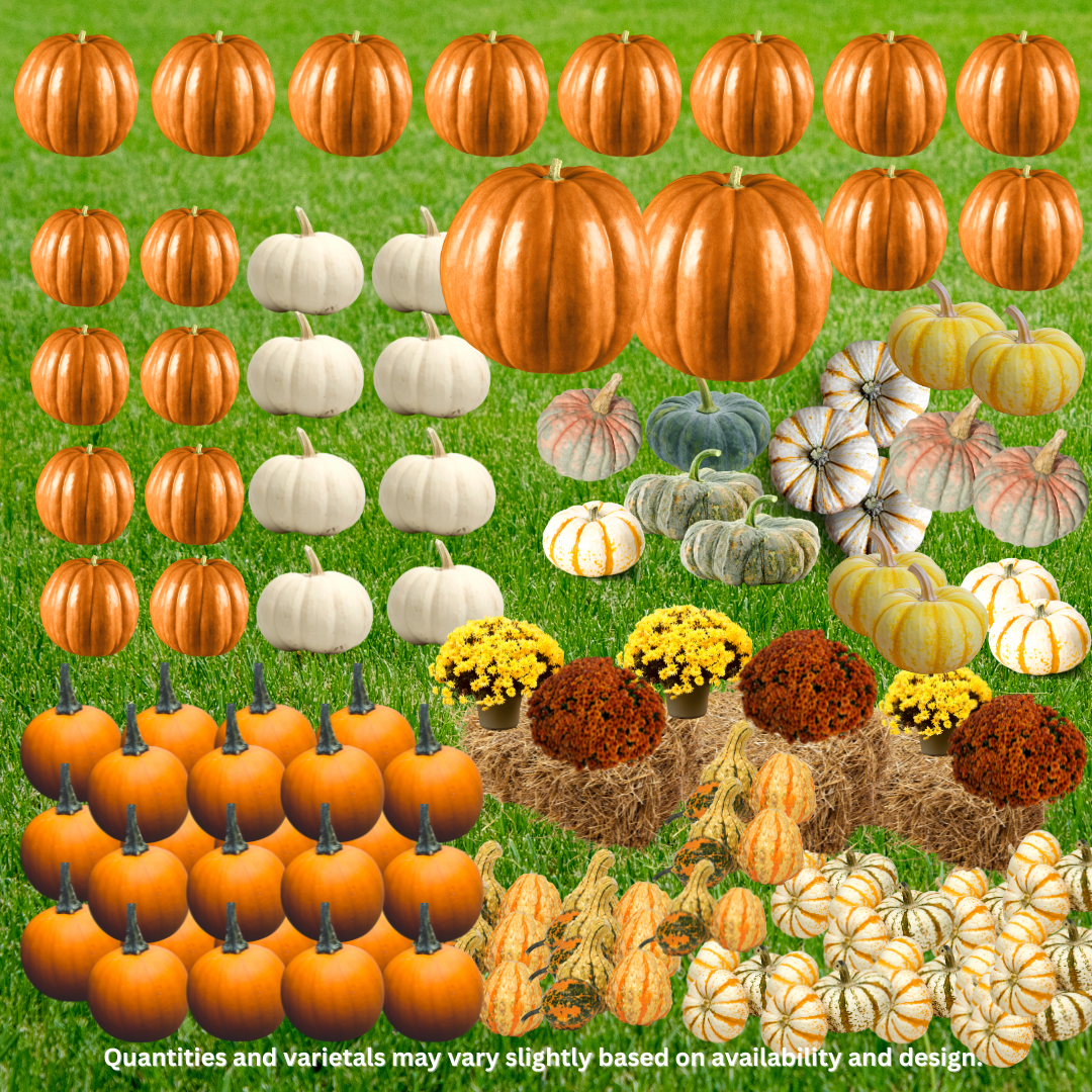 Our biggest and boldest setup — think stunning design, abundant pumpkins and serious porch envy. The two giant Big Mac pumpkins create an amazing photo opportunity and will wow everyone who passes by. This package includes design, hay bales, mums and a cascade of pumpkins and gourds for a stunning display. Perfect for wide porches, multiple steps or anyone hosting a fall party!