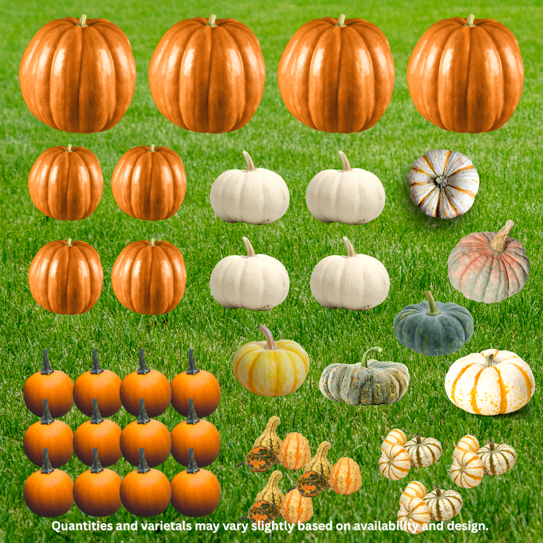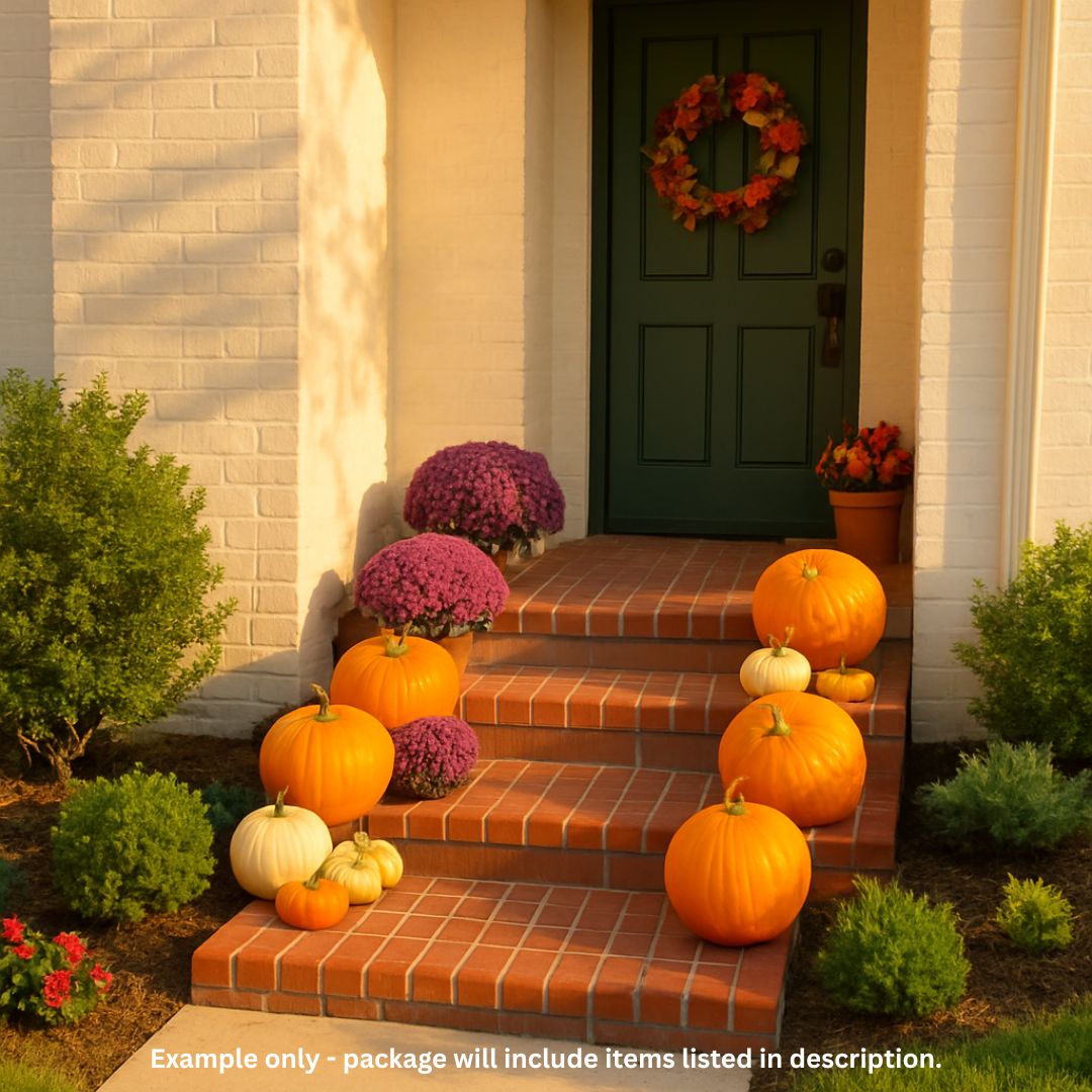 A sweet starter — the perfect gathering of handpicked pumpkins to add a touch of fall charm. This package is perfect for small or narrow porches or if you just want to add a pop of fall to your yard.