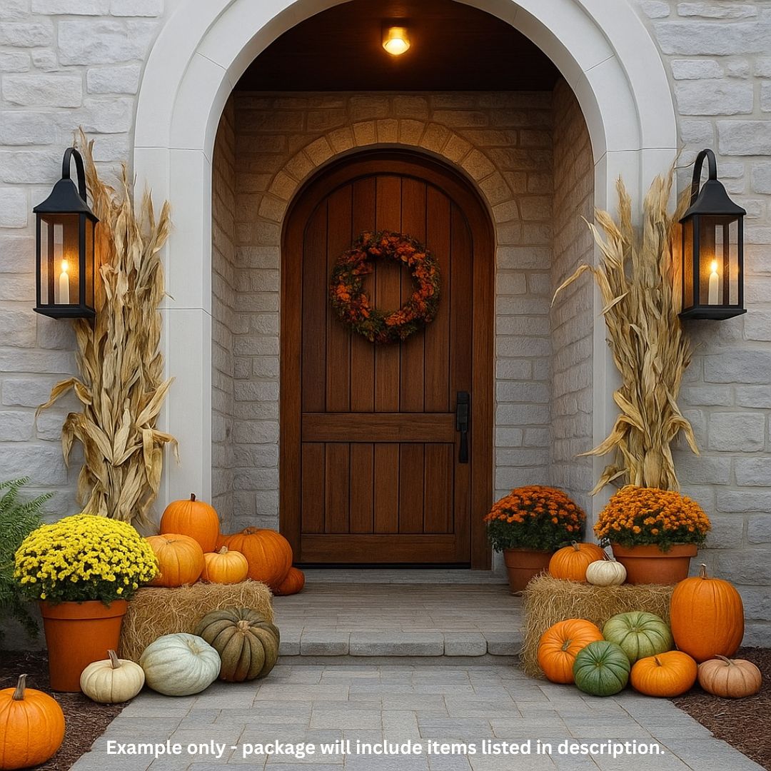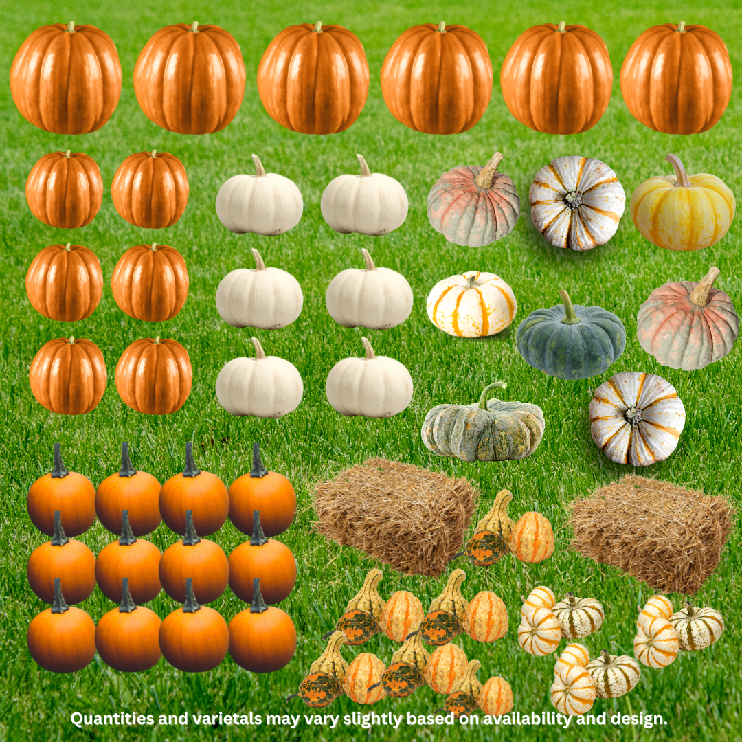 A cozy collection that gives your porch an instant autumn glow. This package includes more pumpkins and gourds for a fuller fall display.